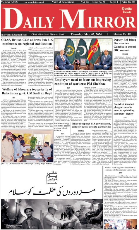 Daily Mirror Quetta. 02-05-2024 On مئی 1, 2024 Share Daily Mirror Quetta Share FacebookTwitterGoogle+ReddItWhatsAppPinterestEmail