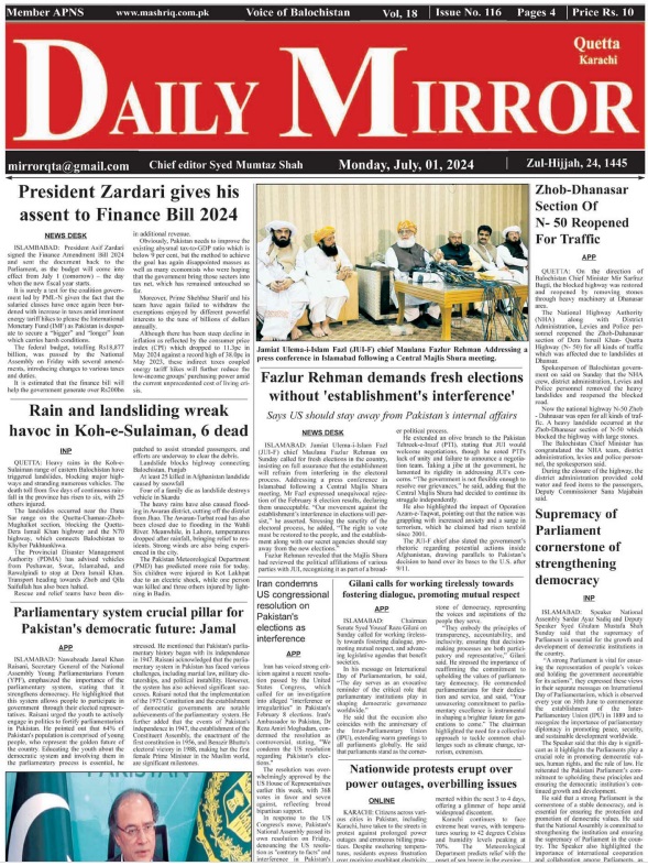 Daily Mashriq Quetta. 01-07-2024 On جولائی 1, 2024 Share Daily Mirror Quetta Share FacebookTwitterGoogle+ReddItWhatsAppPinterestEmail