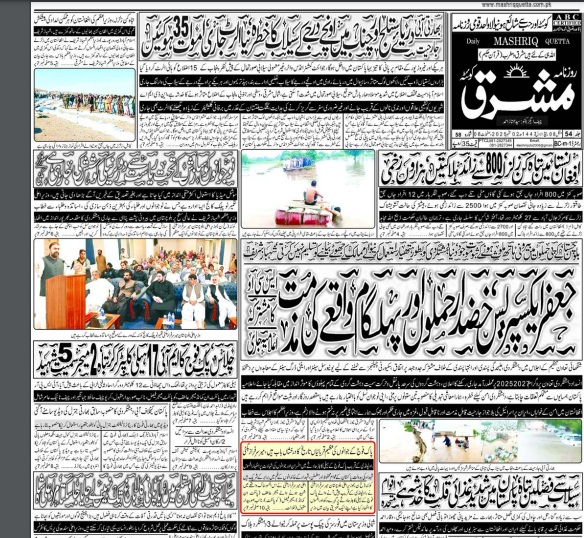 Daily Mashriq Quetta. 02-09-2025 On ستمبر 2, 2025 Share Mashriq 02th September 2025 Share FacebookTwitterGoogle+ReddItWhatsAppPinterestEmail