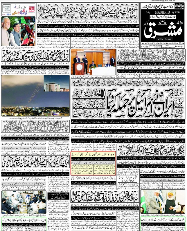 Daily Mashriq Quetta. 10-02-2024 On اکتوبر 2, 2024 Share Mashriq 02 Share FacebookTwitterGoogle+ReddItWhatsAppPinterestEmail