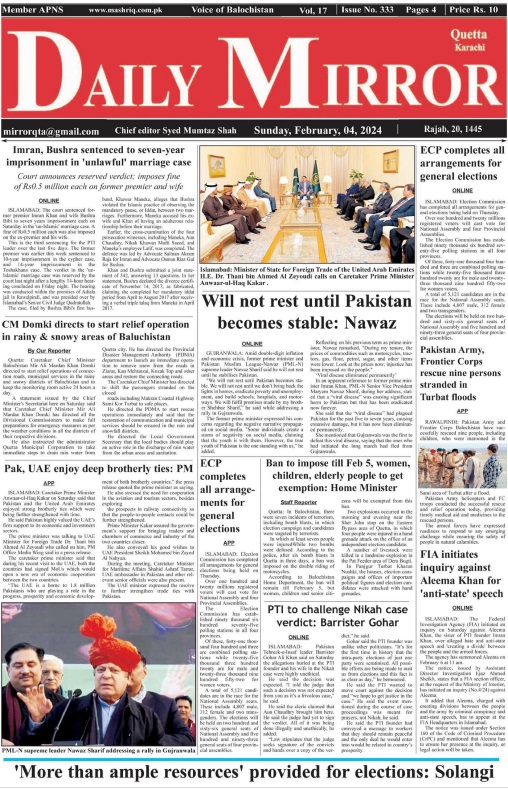 Daily Mirror Quetta. 04-02-2024 On فروری 3, 2024 Share Daily Mirror Quetta Share FacebookTwitterGoogle+ReddItWhatsAppPinterestEmail