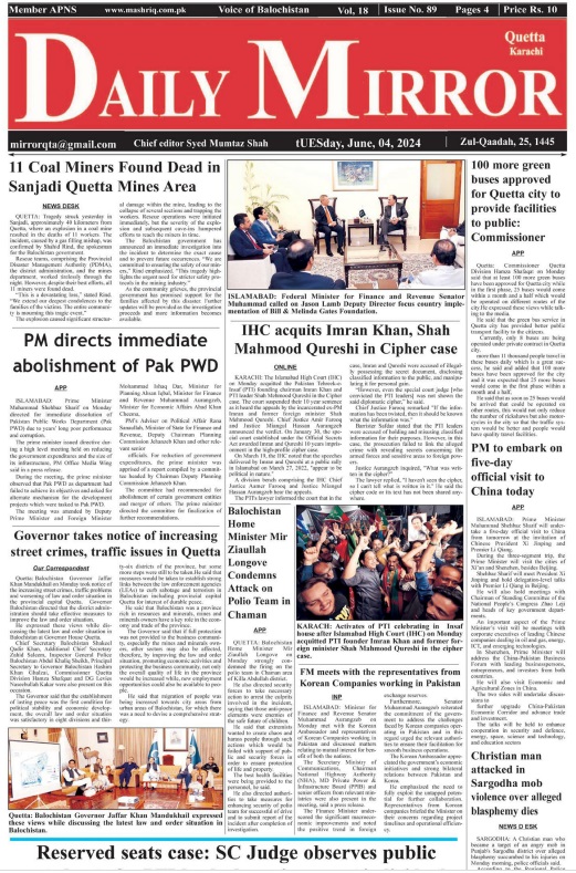 Daily Mirror Quetta. 04-06-2024 On جون 3, 2024 Share Daily Mirror Quetta Share FacebookTwitterGoogle+ReddItWhatsAppPinterestEmail