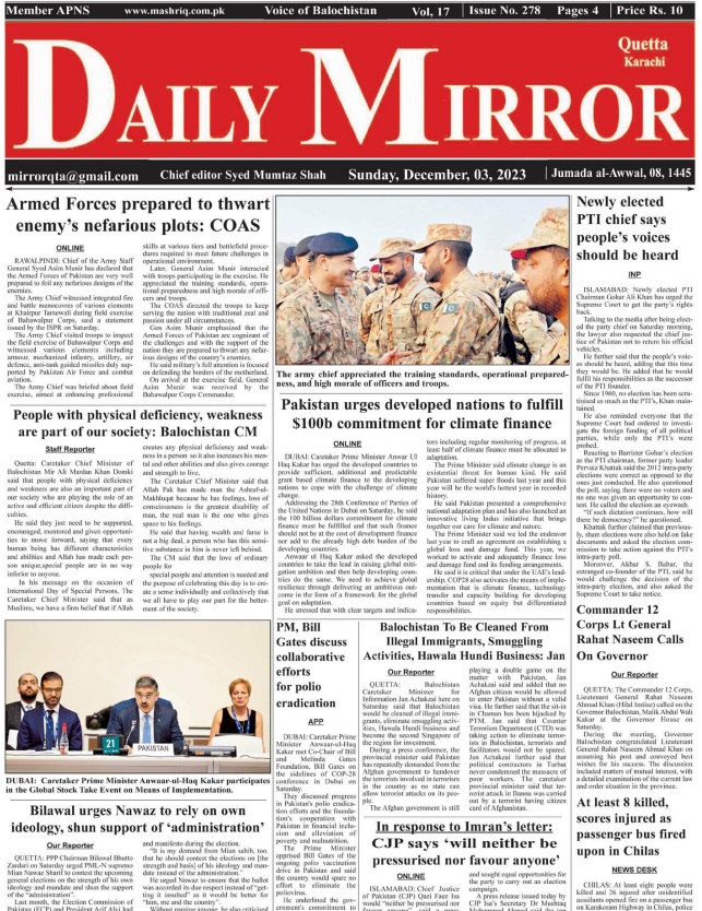 Daily Mirror Quetta. 03-12-2023 On دسمبر 3, 2023 Share Daily Mirror Quetta Share FacebookTwitterGoogle+ReddItWhatsAppPinterestEmail
