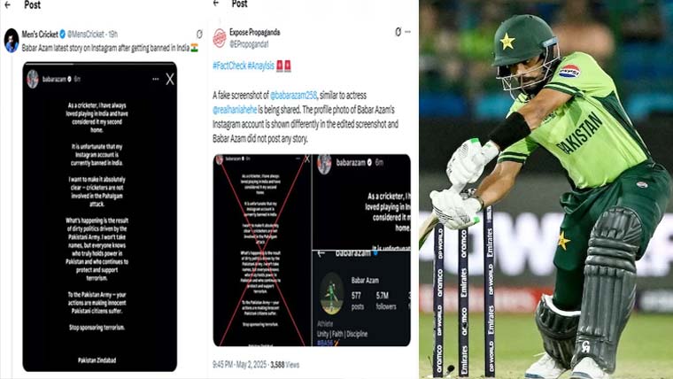 پاکستان کے سٹار بلے باز بابراعظم کی جھوٹی انسٹاگرام سٹوری کی جعلی تصاویر گردش کرنے لگیں جس میں پہلگام واقعہ پر پاک فوج کی مذمت کی گئی تھی۔اس جعلی پوسٹ میں مزید کہا گیا تھا کہ "پہلگام واقعہ میں پاکستانی فورسز کا کردار نامناسب ہے ، میں بطور کرکٹر ہندوستان میں کھیلنا پسند کرتا ہوں اور اُسے دوسرا گھر سمجھتا ہوں، یہ بدقسمتی کی بات ہے کہ بھارت میں میرا انسٹاگرام اکاؤنٹ بلاک کردیا گیا تھا، میں یہ بالکل واضح کرنا چاہتا ہوں کہ پہلگام حملے میں کرکٹرز ملوث نہیں۔بابراعظم کے نام یہ جعلی انسٹاگرام پوسٹ تیزی سے وائرل ہوئی جس کے سکرین شارٹس کئی میڈیا اکاؤنٹس نے بھی شیئر کیے تاہم یہ خبر جھوٹی نکلی۔بھارت میدانِ جنگ میں پاکستان کی مسلح فورسز کی صلاحیتوں کا جواب دینے سے قاصر ہونے کے باعث سوشل میڈیا پر اوچھے ہتھکنڈے استعمال کر رہا ہے ۔