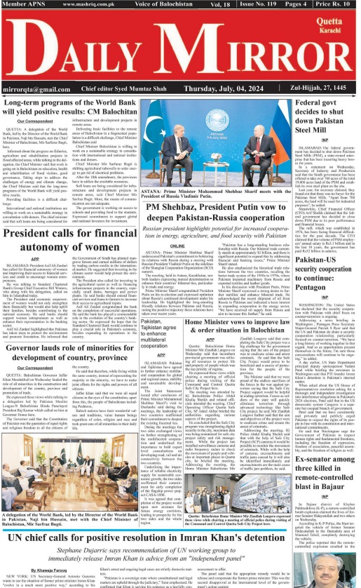 Daily Mirror Quetta. 04-07-2024 – Daily Mashriq Newspaper Quetta