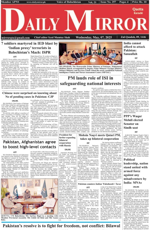 Daily Mirror Quetta. 07-05-2025 On مئی 7, 2025 Share Daily Mirror Quetta 07-05-2025 Share FacebookTwitterGoogle+ReddItWhatsAppPinterestEmail