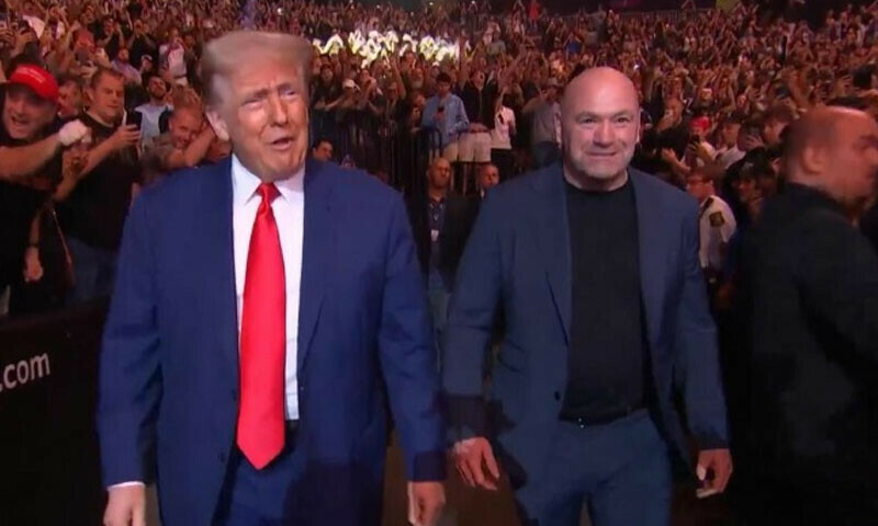 ڈونلڈ ٹرمپ کے ایرینا پہنچنے پر شاندار استقبال کیا گیا، یو ایف سی کے صدر ڈانا وائٹ نے گرم جوشی سے امریکی صدر کو خوش آمدید کہا۔