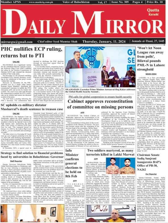 Daily Mirror Quetta. 11-01-2024 On جنوری 10, 2024 Share Daily Mirror Quetta (1) Share FacebookTwitterGoogle+ReddItWhatsAppPinterestEmail