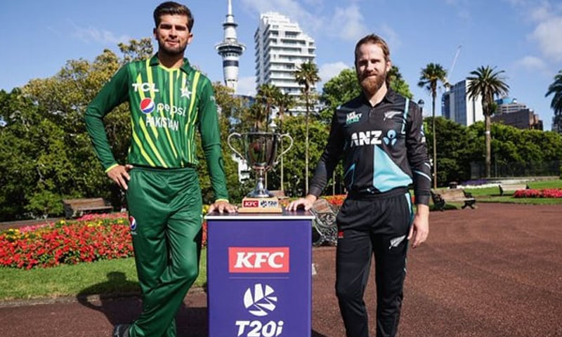 ٹی ٹوئنٹی سیریز میں پانچ میچ کھیلے جائیں گے، ٹرافی کی رونمائی میں قومی ٹیم کے کپتان شاہین آفریدی اور نیوزی لینڈ کے کپتان کین ولیمسن شریک ہوئے۔