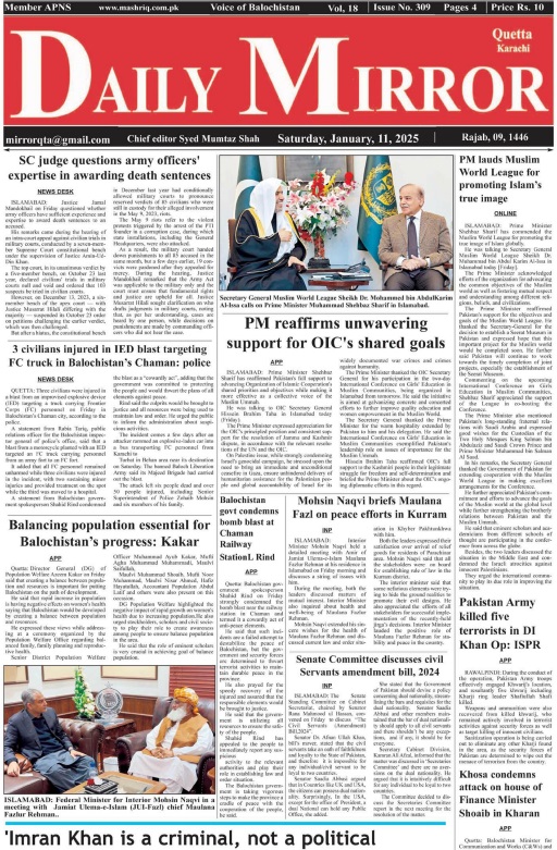 Daily Mirror Quetta. 11-01-2025 On جنوری 11, 2025 Share Daily Mirror Quetta Share FacebookTwitterGoogle+ReddItWhatsAppPinterestEmail
