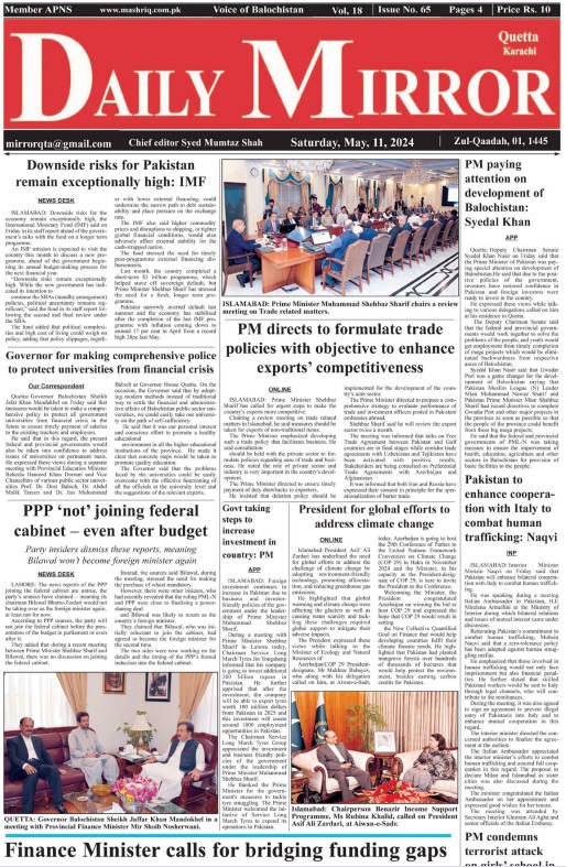 Daily Mirror Quetta. 11-05-2024 On مئی 11, 2024 Share Daily Mirror Quetta Share FacebookTwitterGoogle+ReddItWhatsAppPinterestEmail