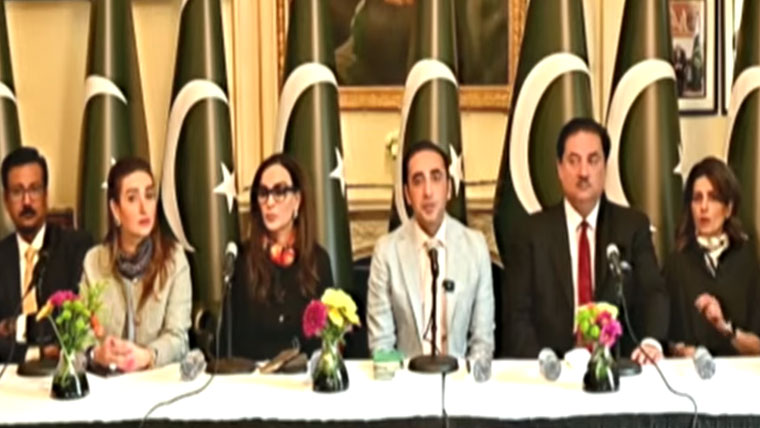 چیئرمین پاکستان پیپلز پارٹی اور پاکستانی سفارتی وفد کے سربراہ بلاول بھٹو زرداری نے کہا ہے کہ مسئلہ کشمیر، پانی سمیت تمام مسائل بات چیت کے ذریعے حل کیے جاسکتے ہیں، بھارت سے مطالبہ کرتے ہیں اپنی خارجہ پالیسی سے دہشتگردی کو بطور ہتھیار استعمال کرنے کی پالیسی ختم کرے، امریکا کو بھارت کو کان سے پکڑ کر بھی بات چیت تک لانا پڑے تو یہ دنیا کے مفاد میں ہوگا۔