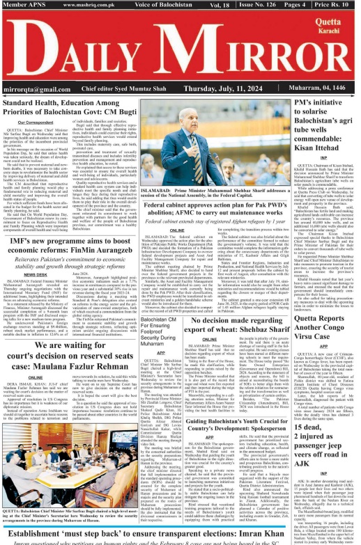 Daily Mirror Quetta. 11-07-2024 – Daily Mashriq Newspaper Quetta