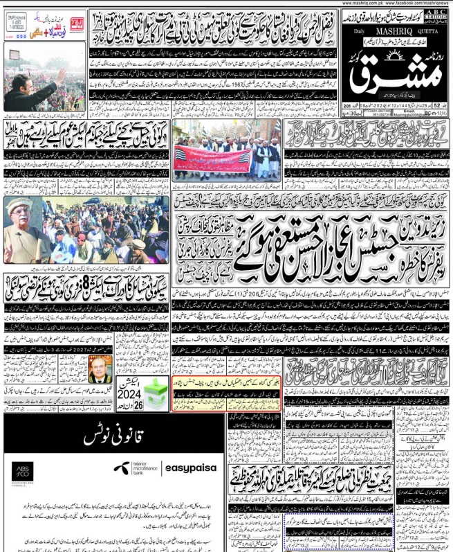 Daily Mashriq Quetta. 12-01-2024 On جنوری 12, 2024 Share mashriq 12 Share FacebookTwitterGoogle+ReddItWhatsAppPinterestEmail