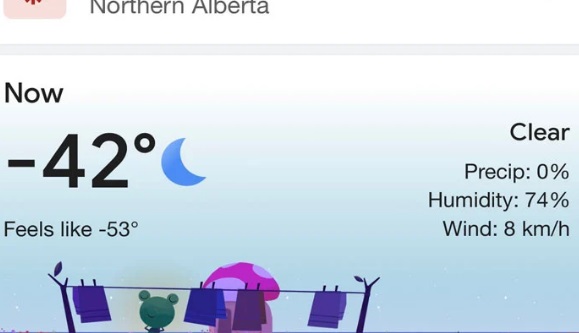 ایڈمنٹن میں منفی 42 ڈگری درجہ حرارت ہے جبکہ ٹھنڈی ہواؤں کے ساتھ منفی 53 ڈگری ریکارڈ کیا گیا ہے۔