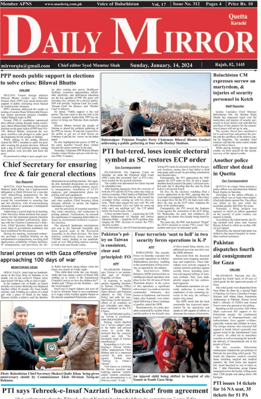 Daily Mirror Quetta. 14-01-2024 On جنوری 13, 2024 Share Daily Mirror Quetta Share FacebookTwitterGoogle+ReddItWhatsAppPinterestEmail