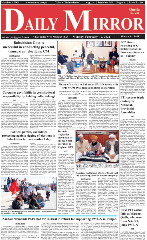 Daily Mirror Quetta. 13-02-2024 On فروری 13, 2024 Share Daily Mirror Quetta Share FacebookTwitterGoogle+ReddItWhatsAppPinterestEmail