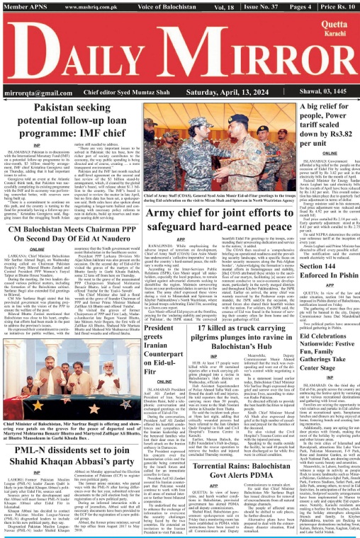 Daily Mirror Quetta. 13-04-2024 On اپریل 13, 2024 Share Daily Mirror Quetta (1) Share FacebookTwitterGoogle+ReddItWhatsAppPinterestEmail