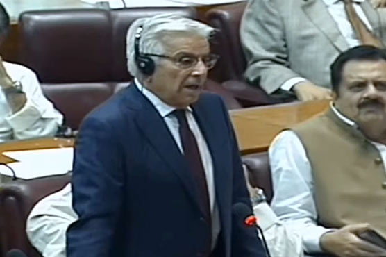 خواجہ آصف کے ریمارکس پر اپوزیشن نے شدید احتجاج کیا اور نعرے بازی بھی کی۔