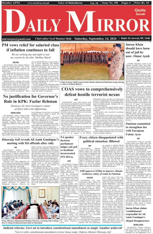 Daily Mirror Quetta. 14-09-2024 On ستمبر 13, 2024 Share Daily Mirror Quetta Share FacebookTwitterGoogle+ReddItWhatsAppPinterestEmail