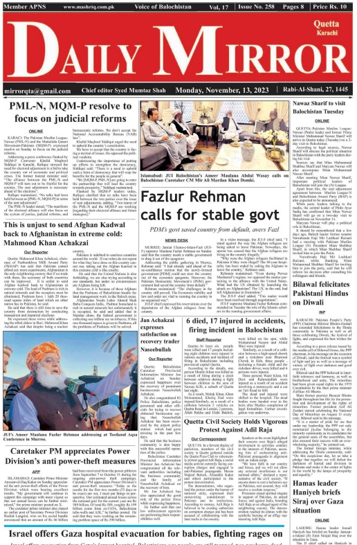 Daily Mirror Quetta. 13-11-2023 – Daily Mashriq Newspaper Quetta