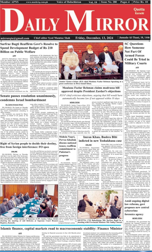 Daily Mirror Quetta. 13-12-2024 On دسمبر 13, 2024 Share Daily Mirror Quetta Share FacebookTwitterGoogle+ReddItWhatsAppPinterestEmail