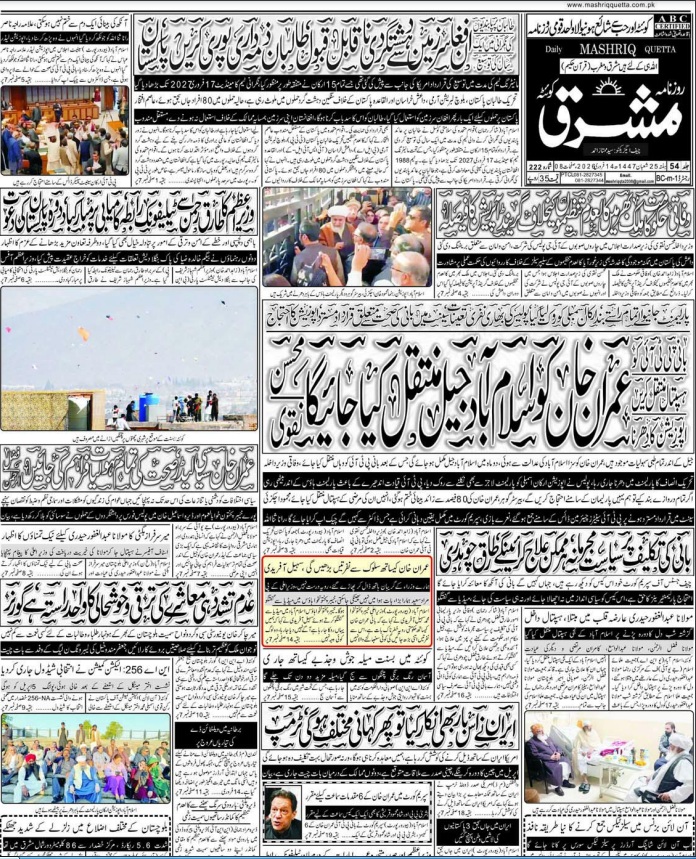 Daily Mashriq Quetta. 14-02-2026 – Daily Mashriq Newspaper Quetta