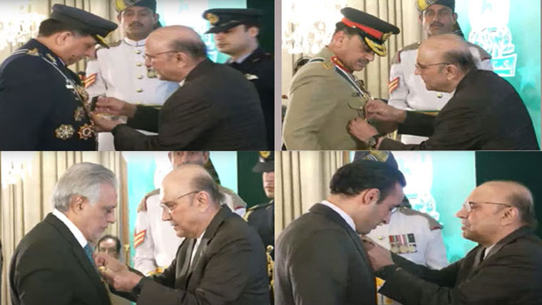اعلیٰ اعزازات دینے کی تقریب میں صدر مملکت آصف علی زرداری نے چیئرمین جوائنٹ چیفس آف سٹاف کمیٹی جنرل ساحر شمشاد مرزا کو ’نشان امتیاز‘ عطاء کیا جبکہ فیلڈ مارشل سید عاصم منیر کو معرکہ حق کے دوران انتہائی مشکل وقت میں جنگ کی قیادت کی لازوال جرات، جنگی مہارت اور غیر متزلزل حب الوطنی کے اعتراف میں ’ہلال جرأت‘ سے نوازا گیا۔