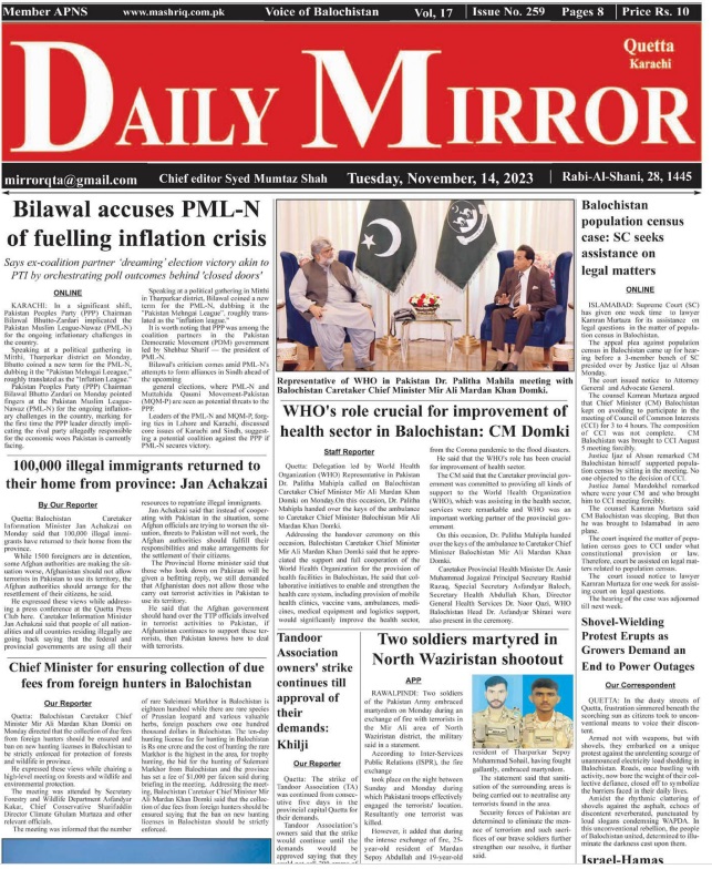 Daily Mirror Quetta. 14-11-2023 On نومبر 14, 2023 Share Daily Mirror Quetta Share FacebookTwitterGoogle+ReddItWhatsAppPinterestEmail