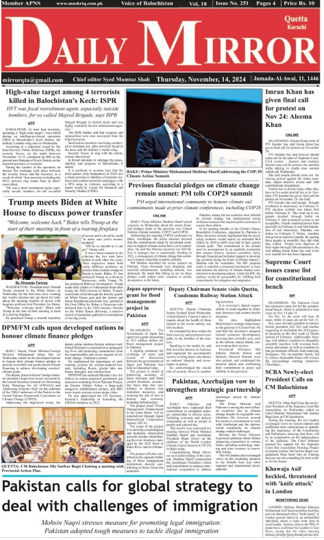 Daily Mirror Quetta. 14-11-2024 On نومبر 14, 2024 Share Daily Mirror Quetta Share FacebookTwitterGoogle+ReddItWhatsAppPinterestEmail