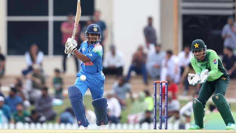 بھارتی بلے باز آیوش مہاترے 38، ویبھو سوریاونشی 5، ویہان ملہوترا 12 اور ویڈانت ترویدی 7 رنز بنا کر پویلین لوٹے، ابھیگیان کنڈو 22، آرون جارج 85، کھیلان پٹیل 6، کنشک چوہان 46، ہینل پٹیل 12 اور دیپیش دیویندرن ایک رنز بنا کر آؤٹ ہوئے۔