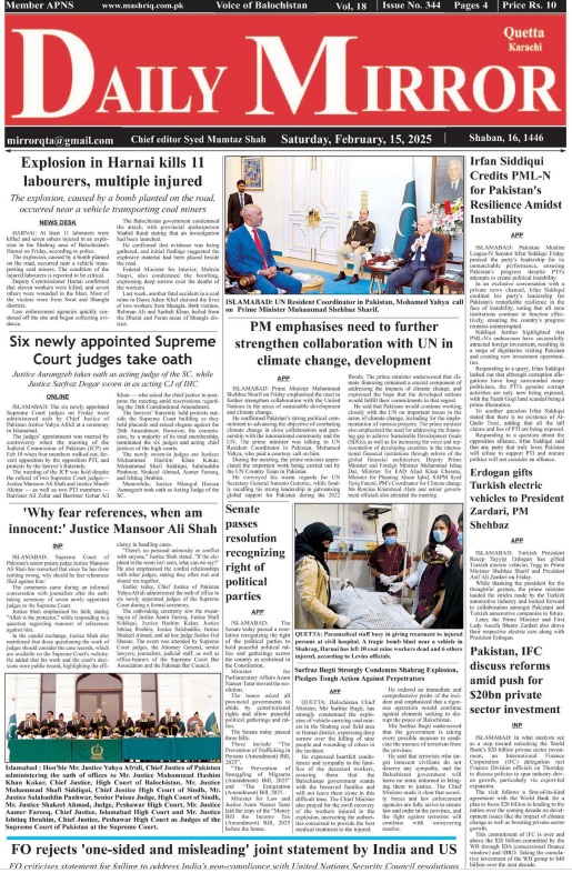 Daily Mirror Quetta. 15-02-2025 On فروری 15, 2025 Share Daily Mirror Quetta Share FacebookTwitterGoogle+ReddItWhatsAppPinterestEmail