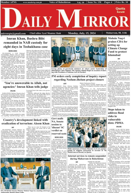 Daily Mirror Quetta. 15-07-2024 On جولائی 15, 2024 Share Daily Mirror Quetta Share FacebookTwitterGoogle+ReddItWhatsAppPinterestEmail