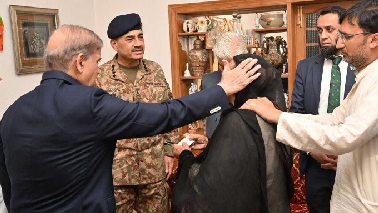 وزیر اعظم شہباز شریف، آرمی چیف جنرل سید عاصم منیر کے ہمراہ سکواڈرن لیڈر عثمان یوسف شہید کی گھر پہنچے اور شہید کے اہلِخانہ سے ملاقات کرتے ہوئے ان سے اظہار تعزیت کیا اور شہید کے درجات کی بلندی کیلئے دعا کی۔
