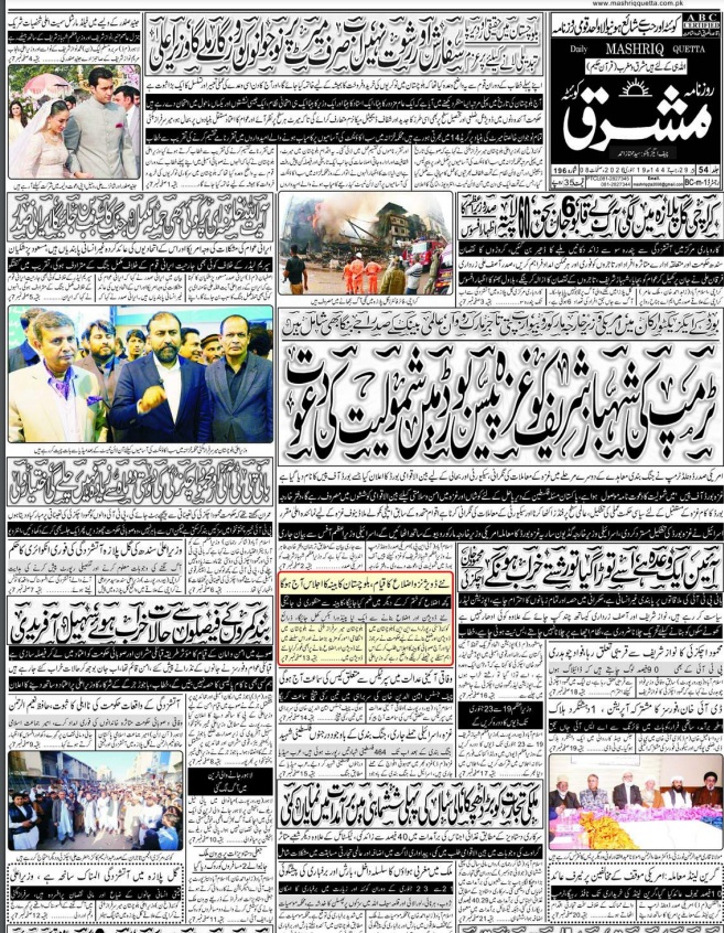 Daily Mashriq Quetta. 19-01-2026 On جنوری 19, 2026 Share Mashriq 19 Januray 2026 Share FacebookTwitterGoogle+ReddItWhatsAppPinterestEmail