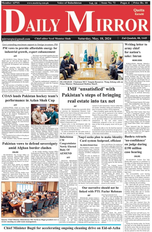 Daily Mirror Quetta. 19-05-2024 On مئی 19, 2024 Share Daily Mirror Quetta Share FacebookTwitterGoogle+ReddItWhatsAppPinterestEmail