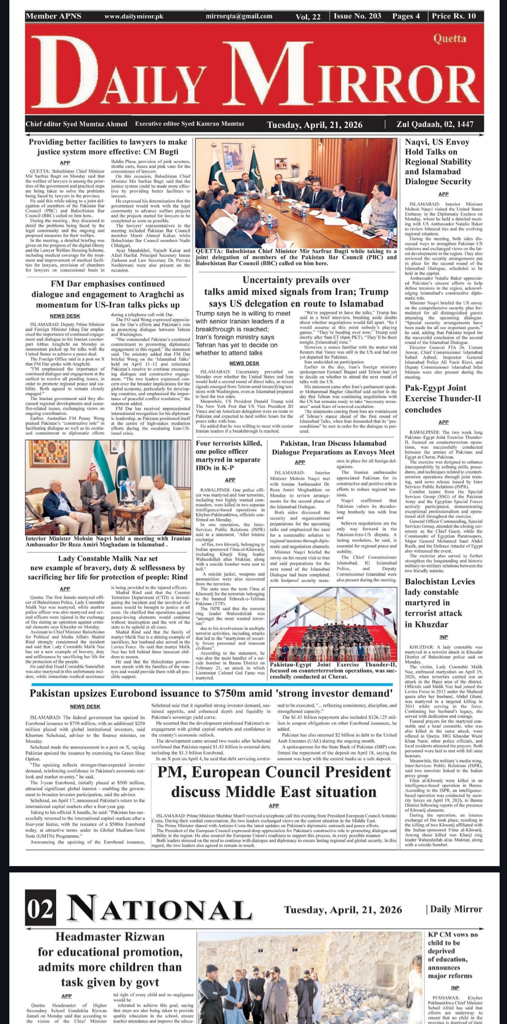 Daily Mirror Quetta.21-04-2026 On اپریل 20, 2026 Share Download Share FacebookTwitterGoogle+ReddItWhatsAppPinterestEmail