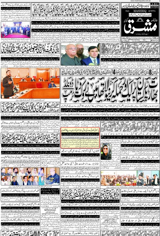 Daily Mashriq Quetta. 20-11-2025 On نومبر 20, 2025 Share Mashriq 20 November 2025 Share FacebookTwitterGoogle+ReddItWhatsAppPinterestEmail