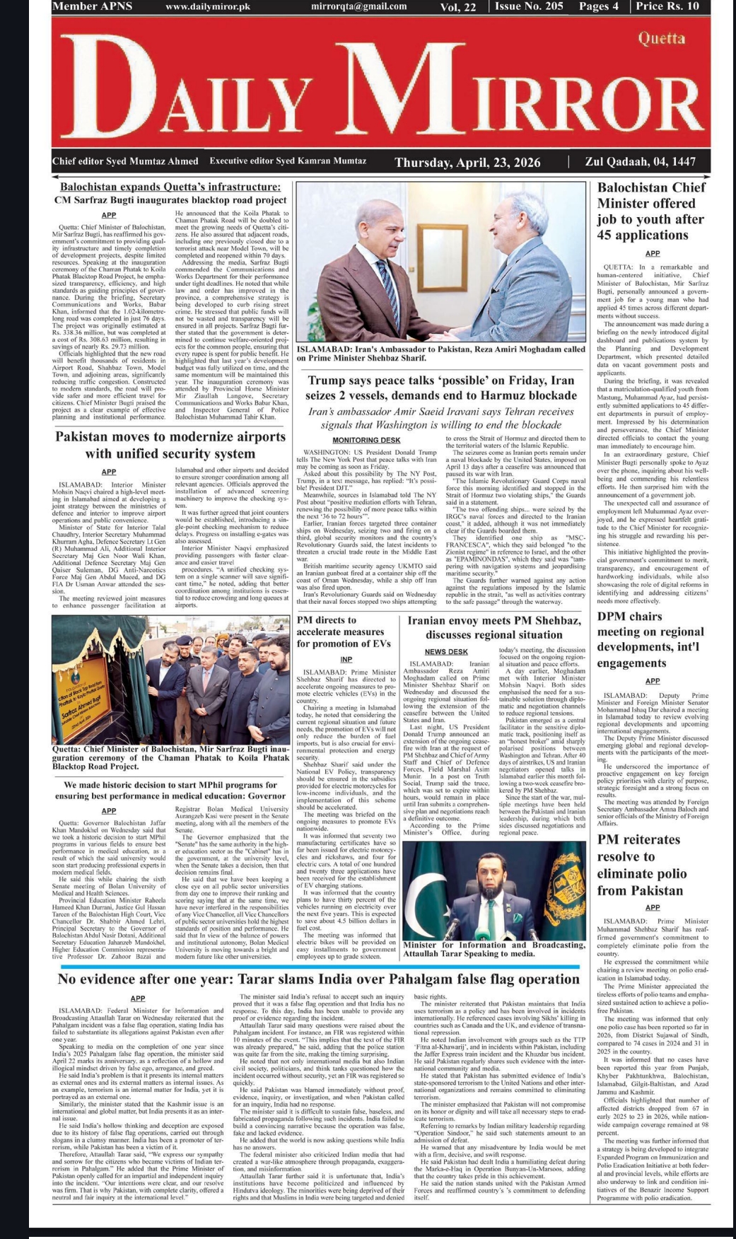 Daily Mirror Quetta.23-04-2026 On اپریل 22, 2026 Share Download Share FacebookTwitterGoogle+ReddItWhatsAppPinterestEmail