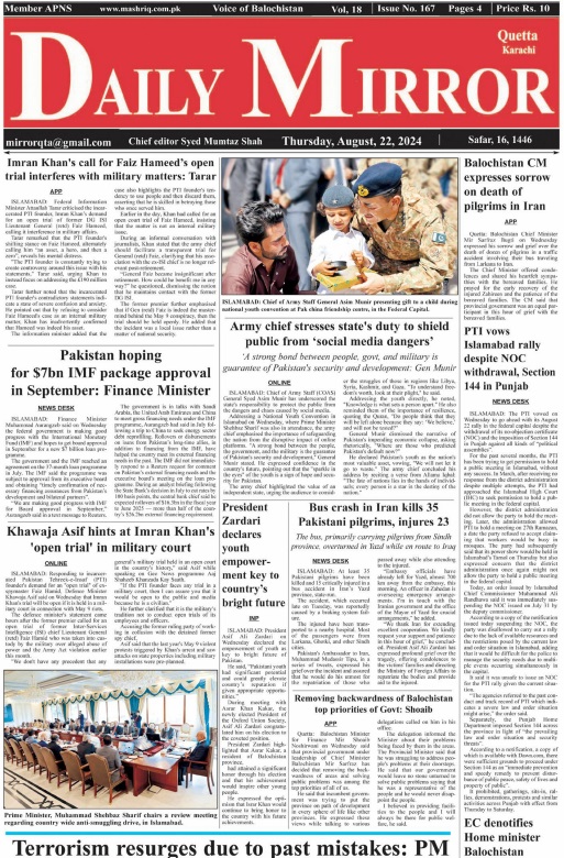 Daily Mirror Quetta. 22-08-2024 On اگست 22, 2024 Share Daily Mirror Quetta Share FacebookTwitterGoogle+ReddItWhatsAppPinterestEmail