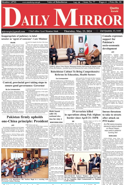 Daily Mirror Quetta. 23-05-2024 On مئی 23, 2024 Share Daily Mirror Quetta Share FacebookTwitterGoogle+ReddItWhatsAppPinterestEmail