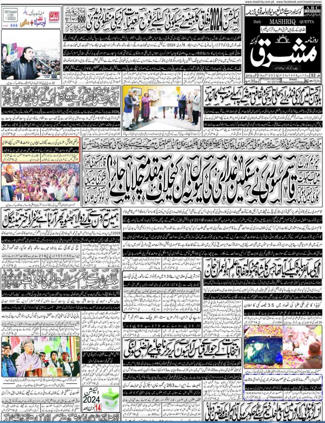 Daily Mashriq Quetta. 24-01-2024 On جنوری 24, 2024 Share Mashriq 23 Share FacebookTwitterGoogle+ReddItWhatsAppPinterestEmail