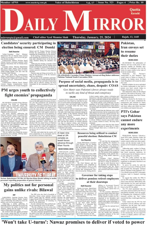 Daily Mirror Quetta. 25-01-2024 On جنوری 24, 2024 Share Daily Mirror Quetta Share FacebookTwitterGoogle+ReddItWhatsAppPinterestEmail