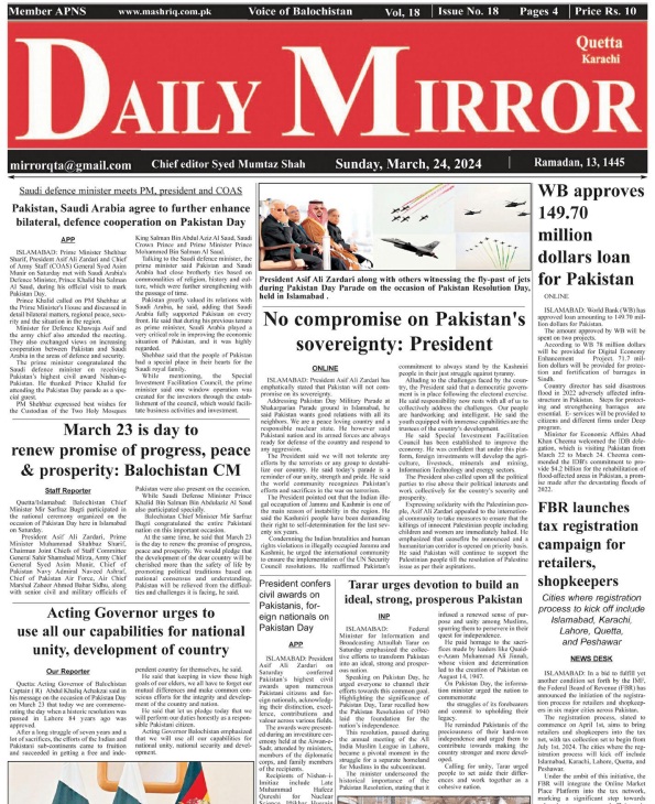 Daily Mirror Quetta. 24-03-2024 – Daily Mashriq Newspaper Quetta