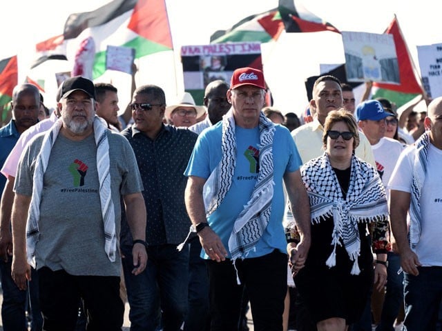 کیوبا کے صدر کی قیادت میں فلسطینیوں کی حمایت میں ریلی نکالی گئی جو امریکی سفارت خانے کے سامنے سے گزری تو شرکا نے امریکا کے خلاف نعرے بازی کی۔