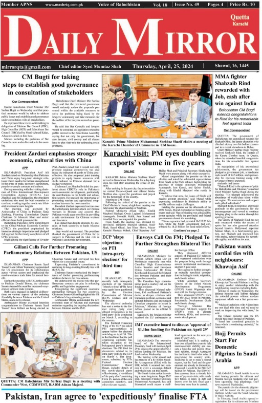Daily Mirror Quetta. 25-04-2024 On اپریل 25, 2024 Share Daily Mirror Quetta Share FacebookTwitterGoogle+ReddItWhatsAppPinterestEmail