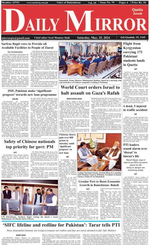 Daily Mirriq Quettta. 25-05-2024 On مئی 25, 2024 Share Daily Mirror Quetta Share FacebookTwitterGoogle+ReddItWhatsAppPinterestEmail