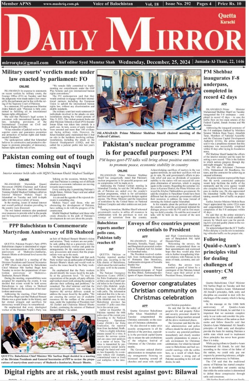 Daily Mirror Quetta. 25-12-2024 On دسمبر 25, 2024 Share Daily Mirror Quetta Share FacebookTwitterGoogle+ReddItWhatsAppPinterestEmail