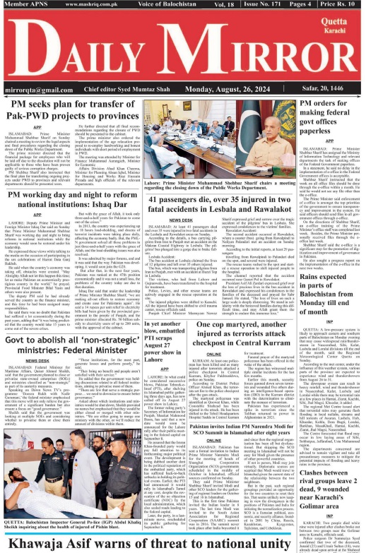 Daily Mirror Quetta. 26-08-2024 On اگست 26, 2024 Share Daily Mirror Quetta Share FacebookTwitterGoogle+ReddItWhatsAppPinterestEmail