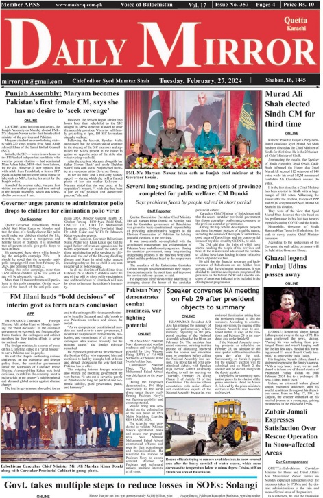 Daily Mirror Quetta. 27-02-2024 On فروری 27, 2024 Share Daily Mirror Quetta Share FacebookTwitterGoogle+ReddItWhatsAppPinterestEmail